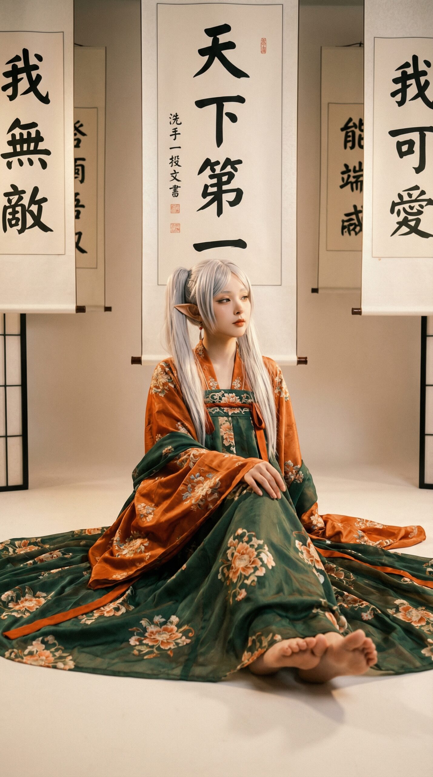 一張絕對實際的真人照片。低角度正面拍攝,一位美麗的年輕東亞女子,她有著銀色長髮,綁成高雙馬尾,清麗的面容,精靈耳,優雅地收腿斜坐在地板上,身著精緻的唐代漢服,橙色和深綠色的絲綢長袍上繡著繁複的花卉圖案,飄逸的長袍鋪滿地面,露出裸足,足趾調皮地蜷曲起來。她目光看向別處。背景是一間簡約的工作室,懸掛著許多大幅的中國書法捲軸,中間那副以漢隸直書:天下第一,左邊寫著:我無敵,右邊寫著:我可愛。。柔和的電影級光線,溫暖的色調,高對比度,8K分辨率,照片級的真實感,傑作般的畫面,景深效果出色。